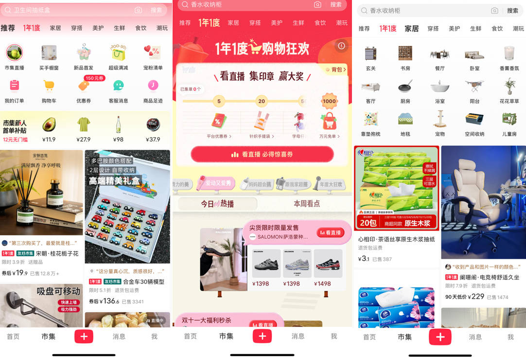 小红书市集在呈现样貌上很像抖音APP和快手APP内的商城栏目,用户可由此一窥小红书货架电商早期产品形态:“推荐”和“1年1度”栏目被放到了顶部导航栏前两位,其中“1年1度”是小红书面向2025年双11推出的大促玩法,小红书站内很多参加双11促销活动的商品已被打上了这个红色标签;紧跟在这两个栏目之后的是包括“穿搭”“亲子”“食饮”在内的10个类目,整个页面为双列瀑布流,商品笔记、商品卡、直播间、短视频等混排其间。